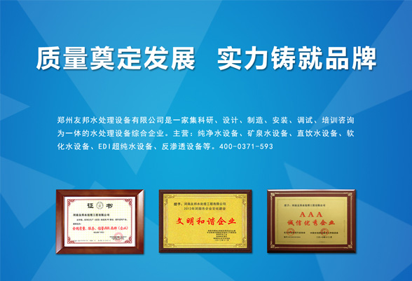 鄭州友邦水處理設備有限公司始創(chuàng)于2003年。自成立以來,友邦始終堅持以“客戶利益為保障”的原則,打造友邦口碑,備受客戶的認可和信賴。鄭州友邦是一家專業從事水處理技術開發(fā),設備制造生產及銷售的企業公司。嚴格的生產管理系統環(huán)環(huán)相扣,層層把關。從原材料選購到現場調試安裝,鄭州友邦重視每個細節(jié)。公司以堅持技術創(chuàng)新、質量創(chuàng)優(yōu)、服務創(chuàng)佳的原則,以優(yōu)質的產品和專業的服務實現我們的承諾:把您擁有的水變成您需要的水!
